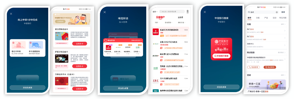 借記卡方面,推出"中信銀行借記卡超市"原子化服務,通過服務卡片,實現借記卡申請和進度查詢,提升交易便捷性。信用卡方面,通過衣食住行娛等生活場景建設,推出"中信銀行信用卡本地生活"原子化服務,在適宜的時間和場景下滿足用戶精準用卡需要。基礎服務方面,推出"中信銀行搜索"原子化服務,提供功能、產品、活動等全方位搜索能力,支持手機銀行APP喚起直達,給用戶帶來靈活輕量的服務體驗。
