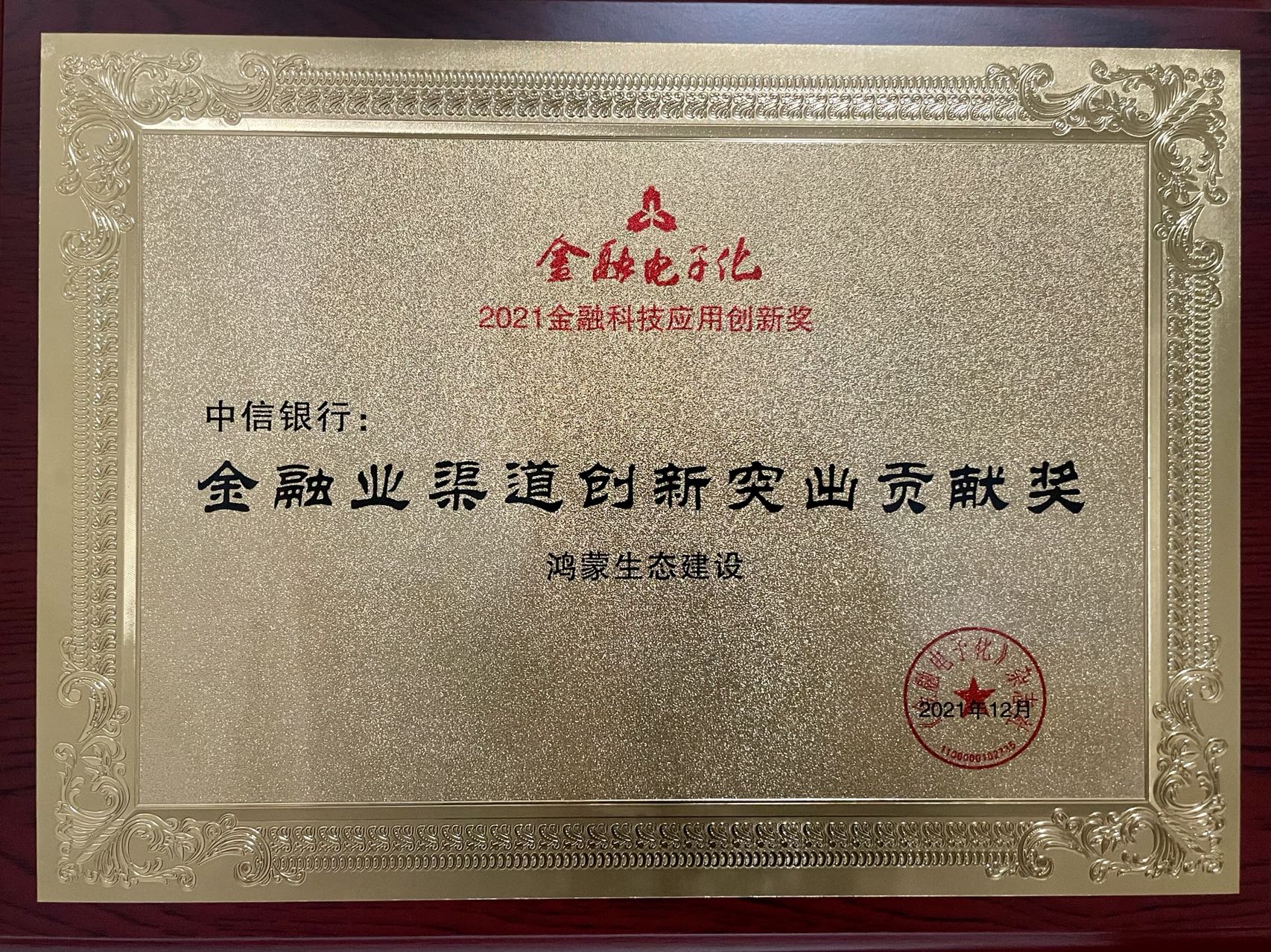 2021年底,我行鴻蒙生態建設項目,榮獲中國人民銀行主管《金融電子化》雜志頒發的"金融業渠道創新突出貢獻獎",獲得業界廣泛認可。