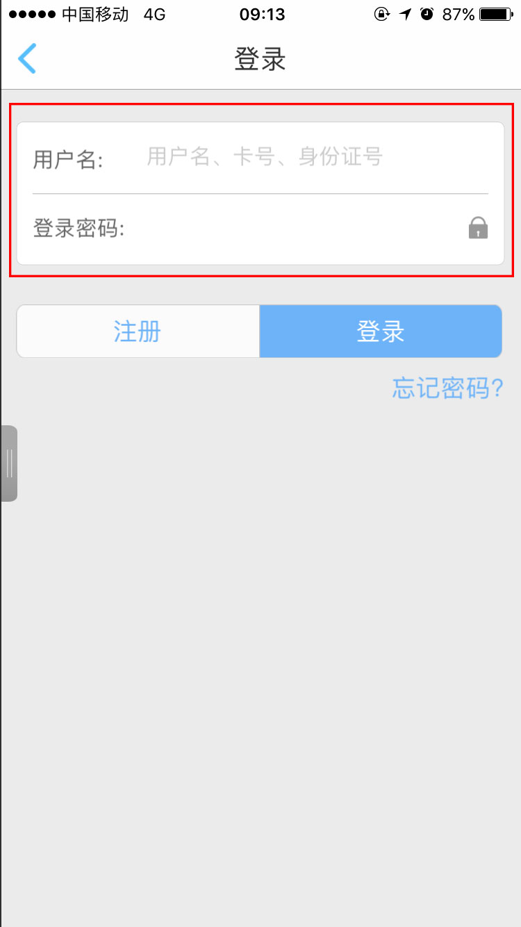 4、登陸您的用戶名(用戶名、卡號、身份證)以及密碼登陸,若密碼錯誤請點擊忘記密碼進行重置。