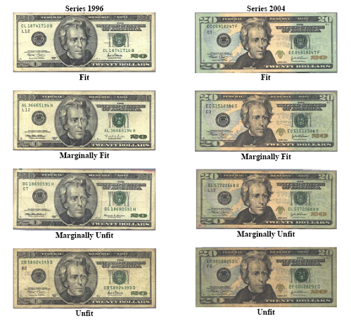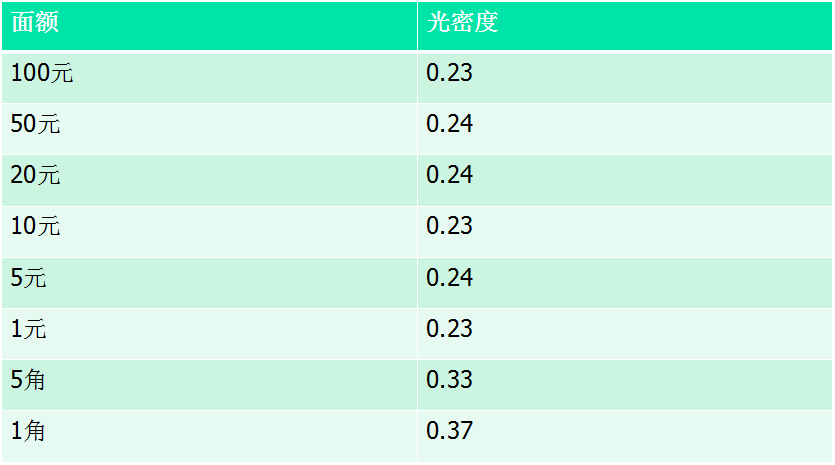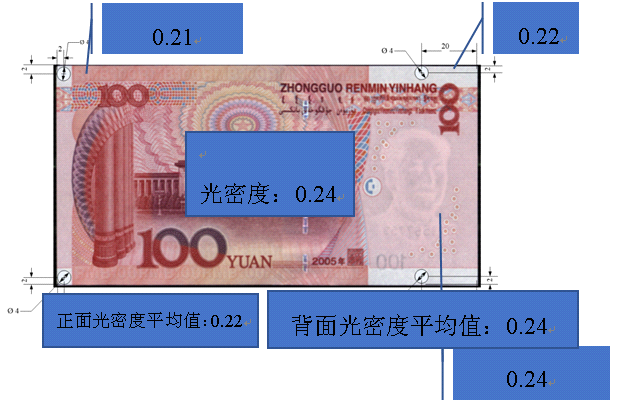 人民幣紙幣在流通過程中自然磨損、老化。使票面整體顏色改變,按照人民銀行規(guī)定的各面額人民幣紙幣采樣點及檢測條件,檢測的人民幣紙幣正面、背面采樣點光密度值分別計算平均值的最大值,若大于等于規(guī)定標準,為不宜流通人民幣。