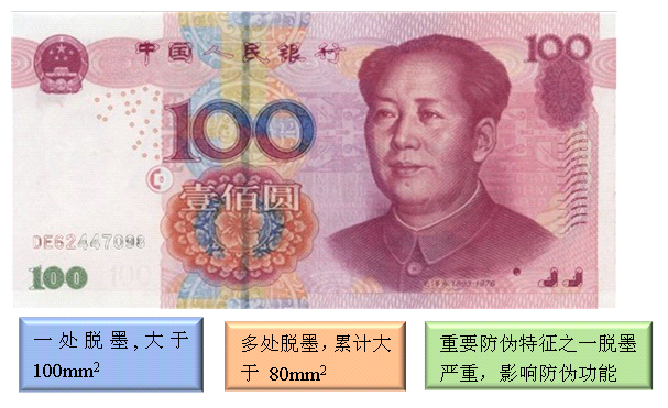 票面脫墨面積雖未超過以上標準,但重要防偽特征之一脫墨嚴重,影響防偽功能的。