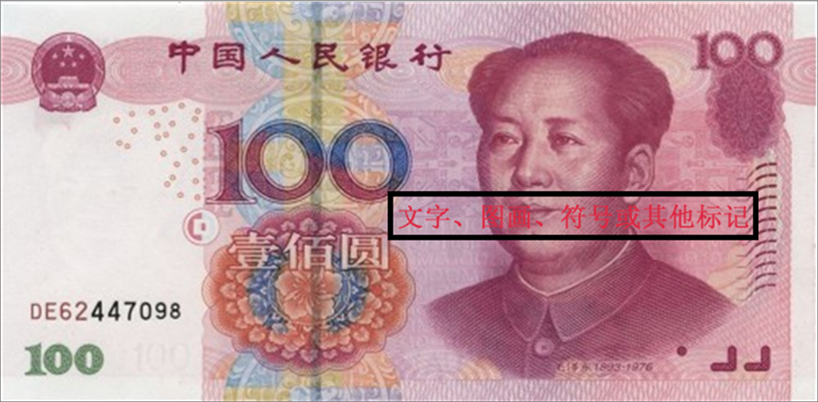 人民幣紙幣票面出現(xiàn)人為的文字、圖畫、符號或其他標記,有下列情形之一的,為不宜流通人民幣: