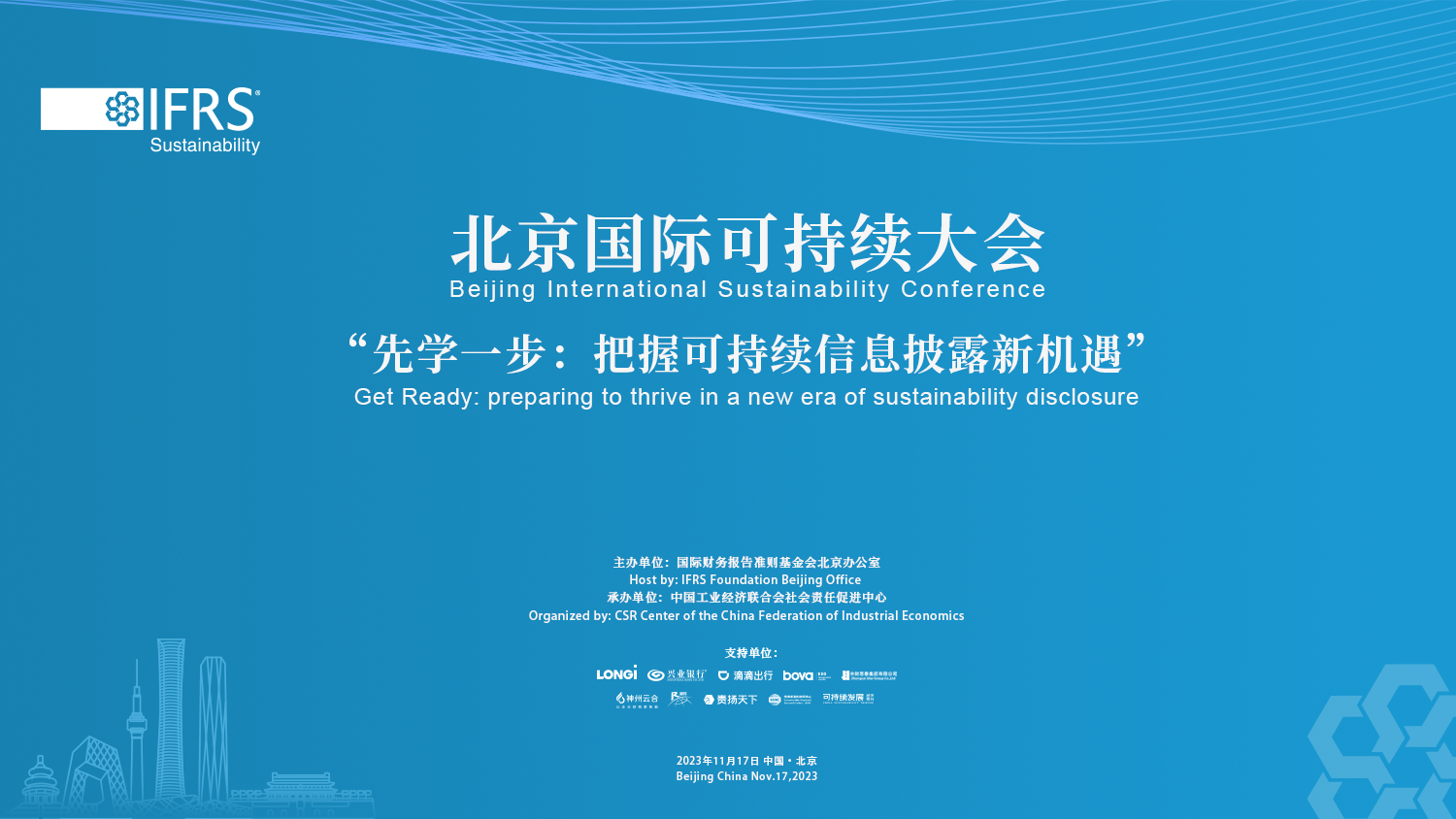 11月17日,國際財務報告準則(IFRS)北京辦公室主辦的“北京國際可持續大會”順利在京召開。本次活動是國際可持續發展準則理事會(ISSB)在今年6月底發布首批國際可持續披露準則(S1和S2)后,首次在中國大陸地區舉辦的國際研討會。大會以“先學一步:把握可持續信息披露新機遇”為主題,詳細介紹了ISSB推出的兩項準則,深入討論了準則在全球范圍內落地的進展情況、落地時面臨的挑戰、克服挑戰時的方案選項、和未來披露趨勢。