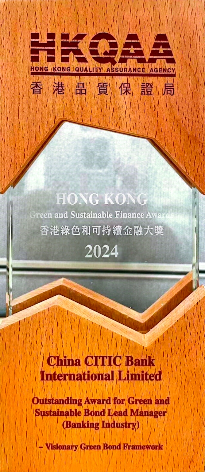 在本次“香港品質保證局35周年暨香港可持續金融及氣候適應年度峰會”上,憑借在中信銀行倫敦分行綠債發行項目中的出色表現,中信銀行(國際)展現其在綠色與可持續債券承銷,綠色與可持續金融領域的專業服務精神以及做出的努力與突破,獲得了“杰出綠色和可持續債券牽頭經辦行(銀行業)- 卓越遠見綠色債券框架”獎項。
