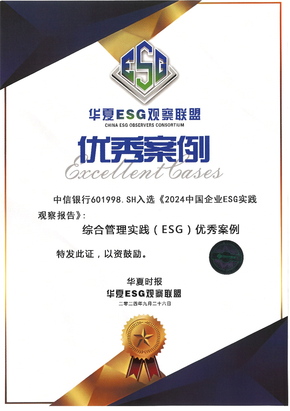 【ESG榮譽】中信銀行入選華夏時報2024中國企業“ESG綜合管理實踐優秀案例”