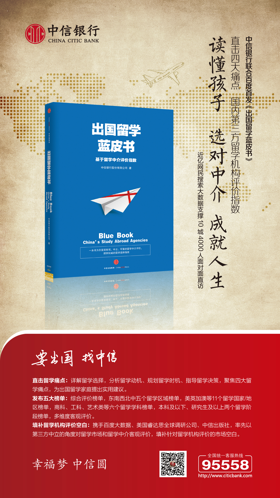 中信銀行作為國內出國金融業務的領跑者,是與留學生接觸最多的銀行,因為每一位赴美留學的中國學生,都要通過中信銀行來辦理簽證。早在1998年,中信銀行就在同行業中率先推出出國金融服務,并一直是美國使館唯一授權的簽證業務辦理機構,截至目前,已為1800萬人提供了出國金融服務。在服務客戶的過程中,中信銀行深深感受到了客戶在面對孩子留學問題上的痛點與迷茫。為此,中信銀行攜手百度、中信出版社、睿達思共同首創了國內留學中介第三方評價體系,并以此為研究基礎,出版了《出國留學藍皮書》,旨在為出國留學人群和中介機構搭建平臺,以促進留學中介行業總體服務水平的提升,幫助更多的家庭和孩子在全球范圍內做最好的留學選擇。