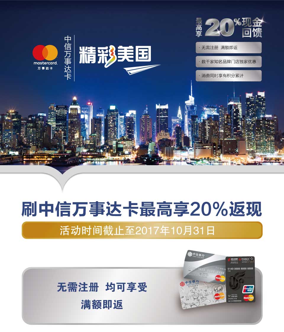 中信萬事達(dá)卡美國享20%返現(xiàn)