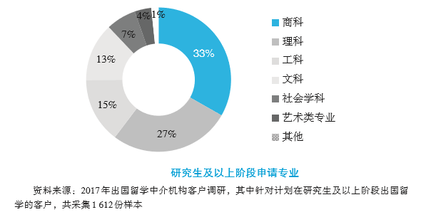 不同于大學(xué)階段申請(qǐng)專業(yè)選擇較為分散的情況,研究生及以上階段的專業(yè)選擇集中在商科和理科,分別占比33%和27%,這與研究生及以上階段的學(xué)生以就業(yè)為導(dǎo)向的學(xué)習(xí)目的相符。工科和文科的熱度有所下降,分別占比15%和13%。而社會(huì)學(xué)科和藝術(shù)類專業(yè)的選擇情況則與本科階段沒有較大差異,分別占比7%和4%。