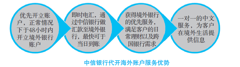 目前,中信銀行已與澳大利亞聯邦銀行、加拿大皇家銀行、美國華美銀行、中信銀行(國際)合作,可為客戶開立澳大利亞、加拿大、美國和中國香港賬戶。