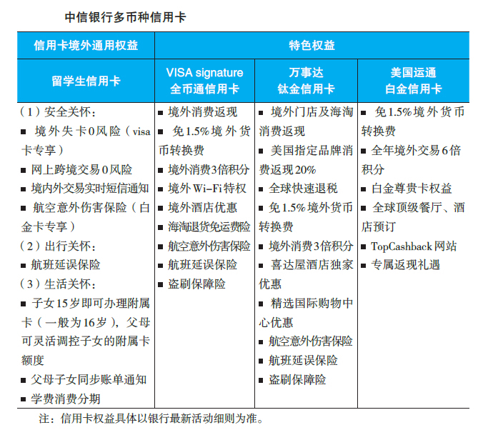 在海外消費方面,目前國際卡組織和國內發卡銀行與境外商戶合作,為留學生海外消費提供眾多便利和優惠,是留學生消費、省錢的好幫手。以中信銀行為例,有多種配有國外權益的信用卡可供留學生選擇。