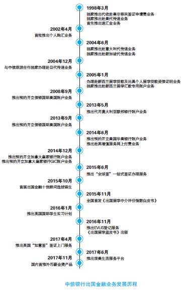 出國金融是由中信銀行首家推出、針對出國人員和來華外籍人士等提供的一整套安全、快捷、便利的多樣化金融服務。未來,中信銀行將繼續與優質資源跨界融合,圍繞留學周期提供專屬增值服務,滿足背景提升、海外安全、全球實習等需求,打造線上+線下,金融+非金融的出國金融服務生態圈。