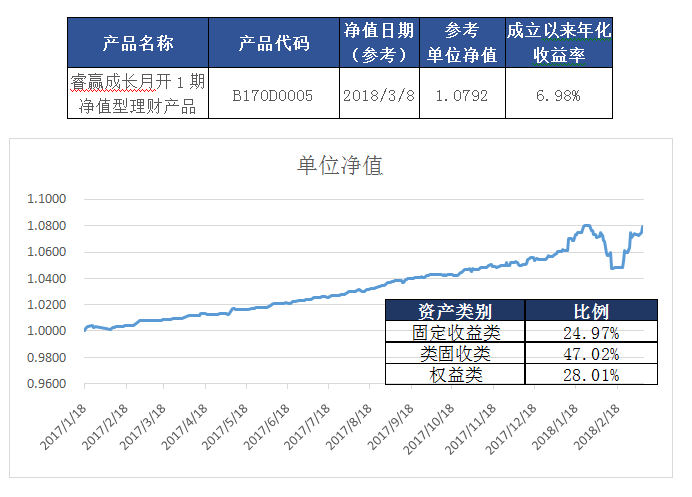 本產品將于2018年3月12日再次開放申購贖回,自2017年1月18日成立以來,截至2018年3月8日,本產品本次開放周期累計凈值1.0792,成立以來年化收益率6.98%。