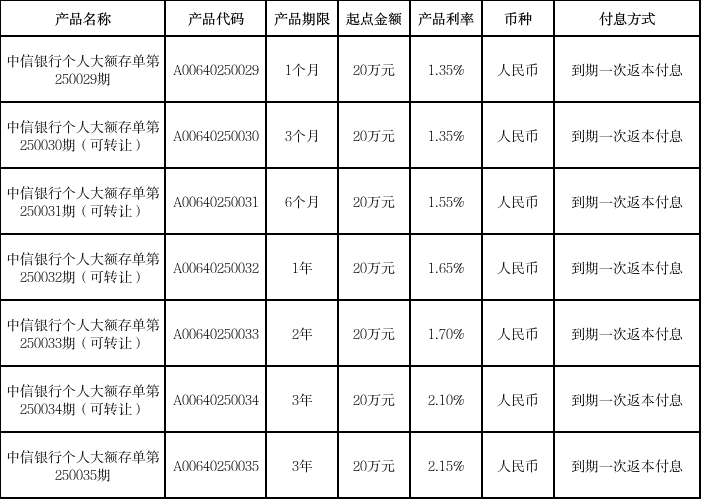 中信銀行將于2025年5月1日發行中信銀行個人大額存單第250029-250035期產品,產品要素如下: