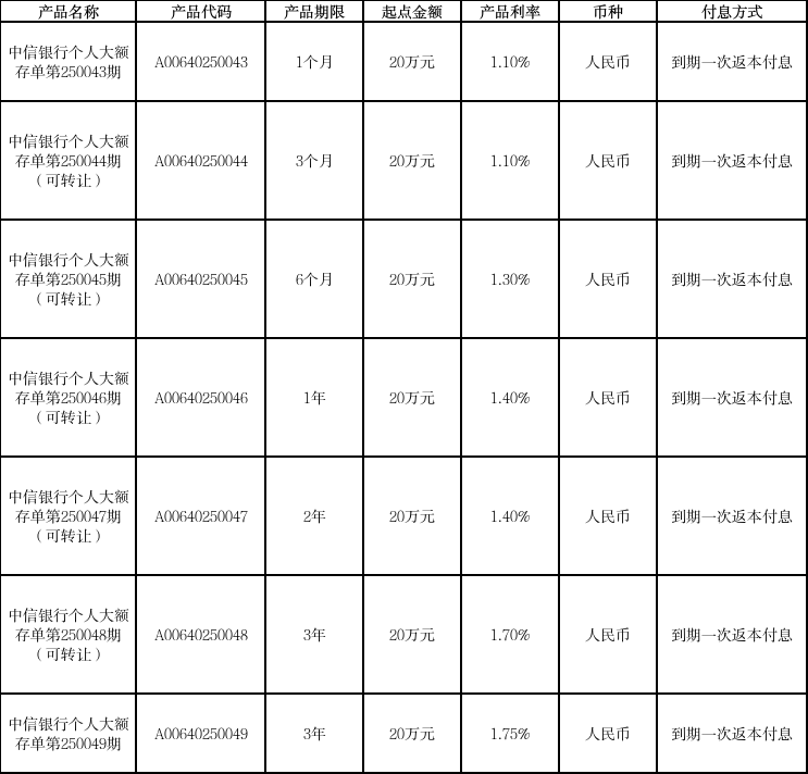 中信銀行將于2025年6月1日起發行個人大額存單第250048-250049期產品;2025年6月3日起發行個人大額存單第250043-250047期產品,產品要素如下: