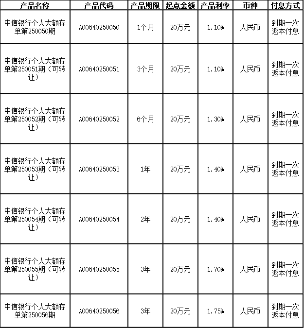 中信銀行個人大額存單第250050-250056期發行公告