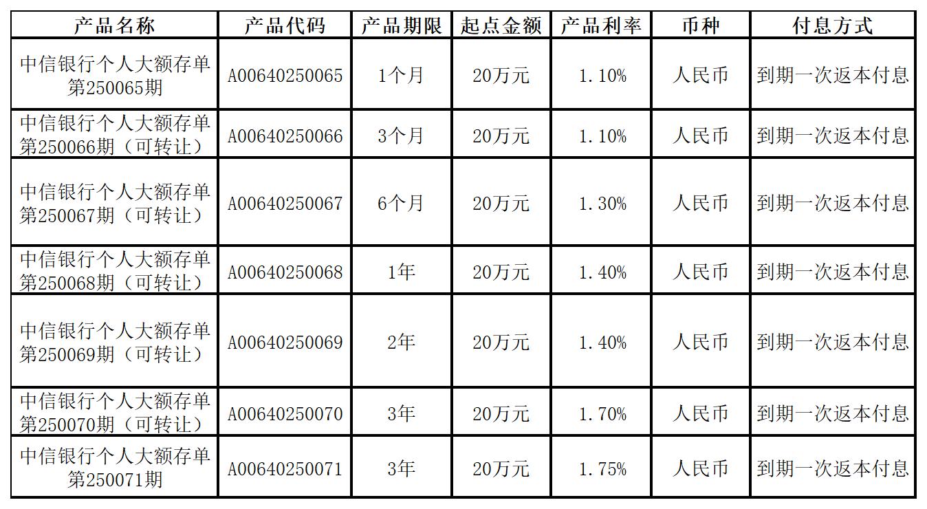 中信銀行將于2025年9月1日起發行個人大額存單第250065-250071期產品,產品要素如下: