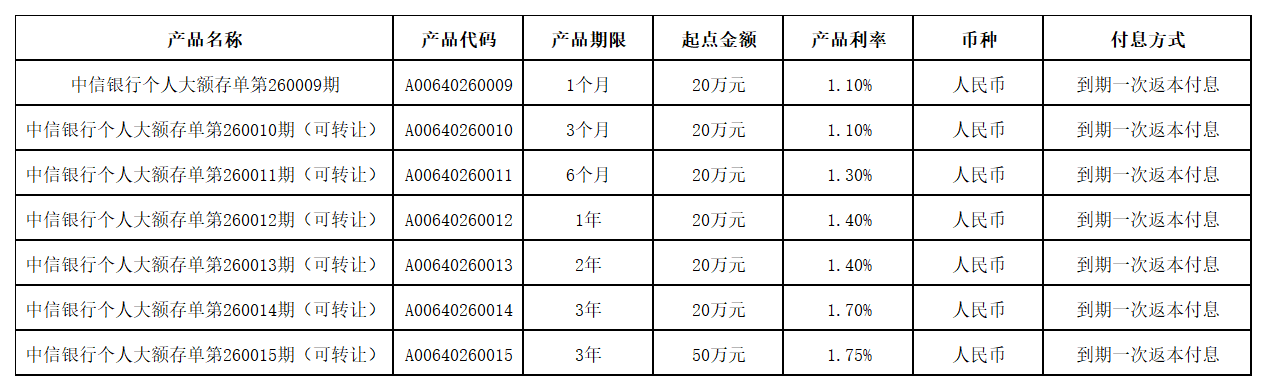 中信銀行將于2026年2月1日起發行個人大額存單第260009-260015期產品,產品要素如下: