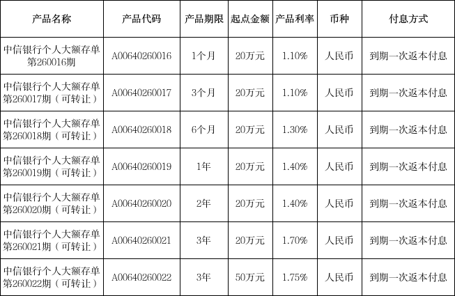 中信銀行個人大額存單第260016-260022期發(fā)行公告