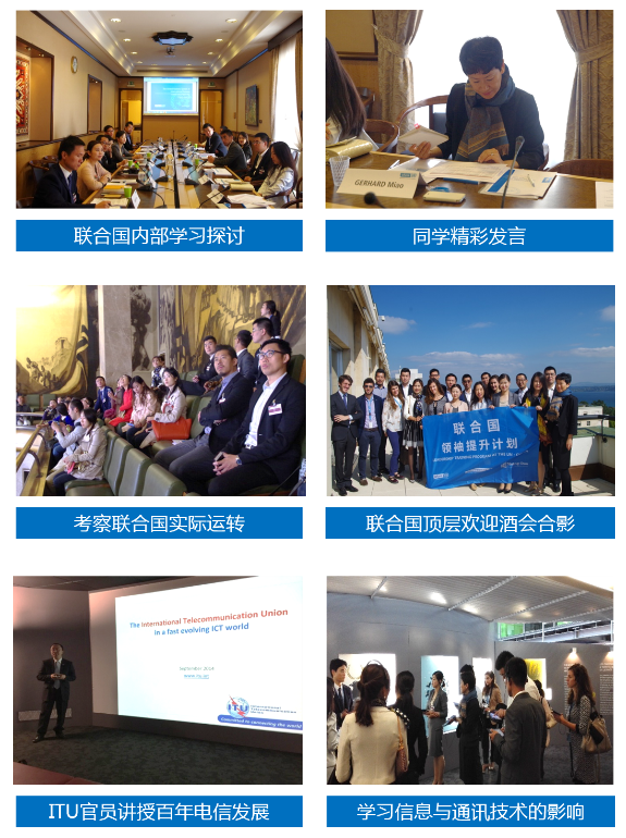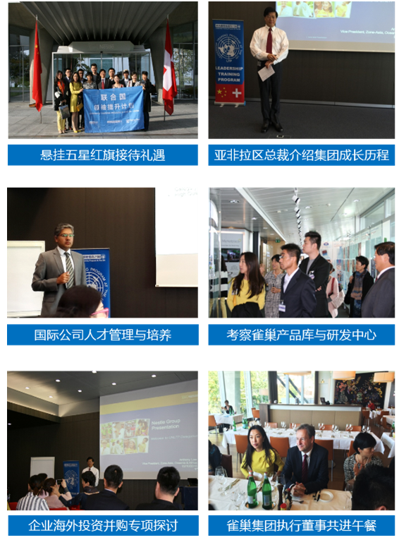 聯合國領袖提升計劃將深入日內瓦萬國宮及各大國際機構總部(世界貿易組織WTO,世界衛生組織WHO、國際電信聯盟ITU等),實地考察國際機構運轉,與官員及專家對話交流,獲取最新資訊。同時組織參訪瑞士代表企業,(如銀行金融業,食品集團,鐘表企業、酒店行業等)學習瑞士企業精藝理念與最新行業發展趨勢,感受優秀員工體系及制度文化,精益管理藝術,實地探討解決自身企業問題。同到訪企業會談交流,拓展商業機會。