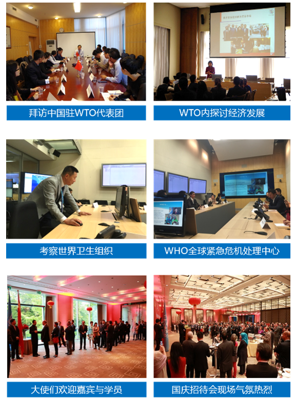 拜訪中國駐世貿組織代表團,共話當前國際貿易形勢下中國企業家新機遇。隨后前往世界貿易組織WTO訪問, 了解TWO如何解決國際貿易爭端及反傾銷。考察世界衛生組織WHO,并對話世衛專家:了解疾病控制與預防。學習生物制品的國際標準,感受世衛組織如何領導全球衛生健康,及世衛與民間的合作。晚上參加中國駐聯合國日內瓦辦事處及使團主辦的中華人民共和國成立67周年招待晚宴,與眾聯合國大使和國際機構官員面對面交流,拓展國際合作機會。