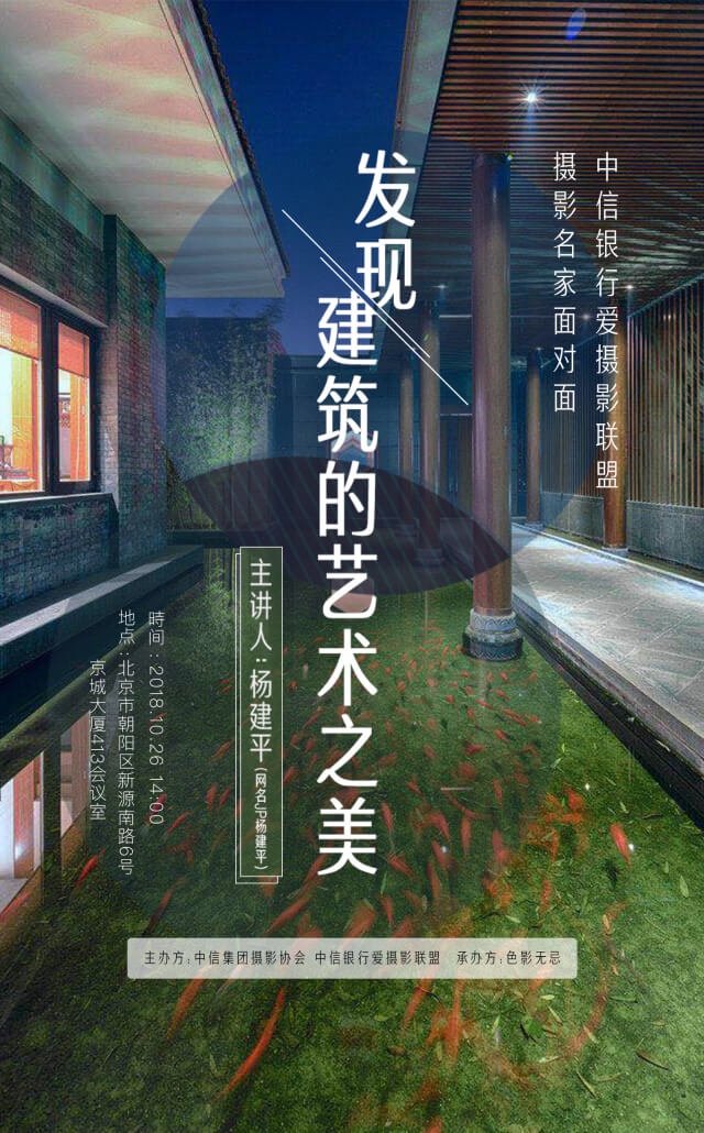 10月26日相約北京,主講人楊建平將從拍攝知識、光線把握、拍攝技巧、審美修養等方面,為各位介紹建筑拍攝的方法,帶領觀眾欣賞不同建筑所獨具的美感。