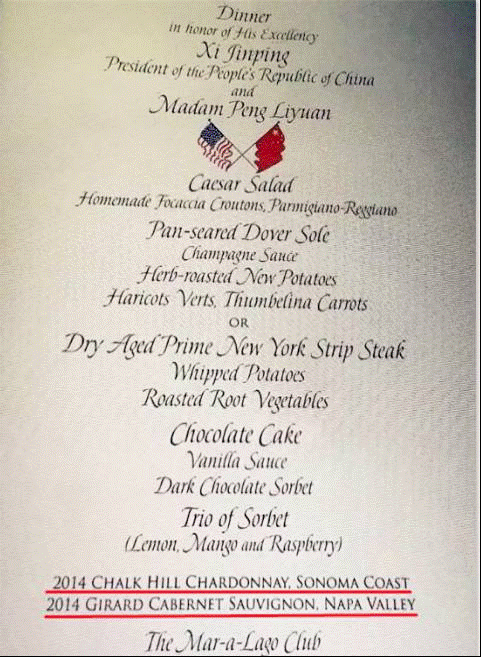 4月6日,川普在美國佛羅里達州海湖莊園舉行晚宴,歡迎(xi)大大及(peng)麻麻的來訪。那么在這個重要的晚宴上,川普選擇了什么美酒呢? 請先看看晚宴菜單: