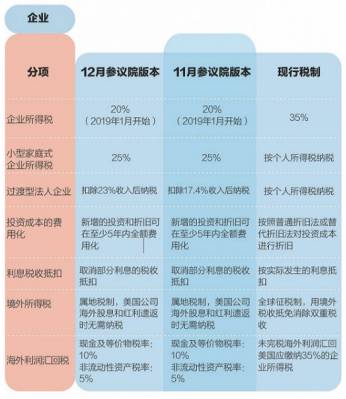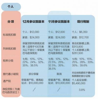 在個稅方面,參議院稅改法案支持施行7個檔位,并將最高稅率下調至38.5%。標準稅收抵扣額將翻倍,兒童補貼也將大幅提高。